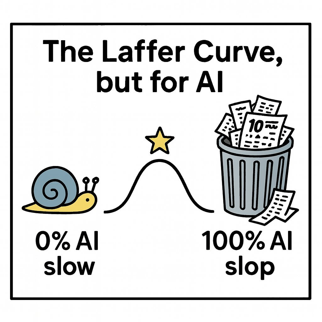 The optimal amount of AI is not 100%. After all: 0% AI is slow, but 100% AI is slop. So the optimal amount of AI is actually between 0-100%. Yes, the exact figure varies by situation, but just the idea that 0% and 100% are both suboptimal is useful. It's the Laffer Curve, but for AI: